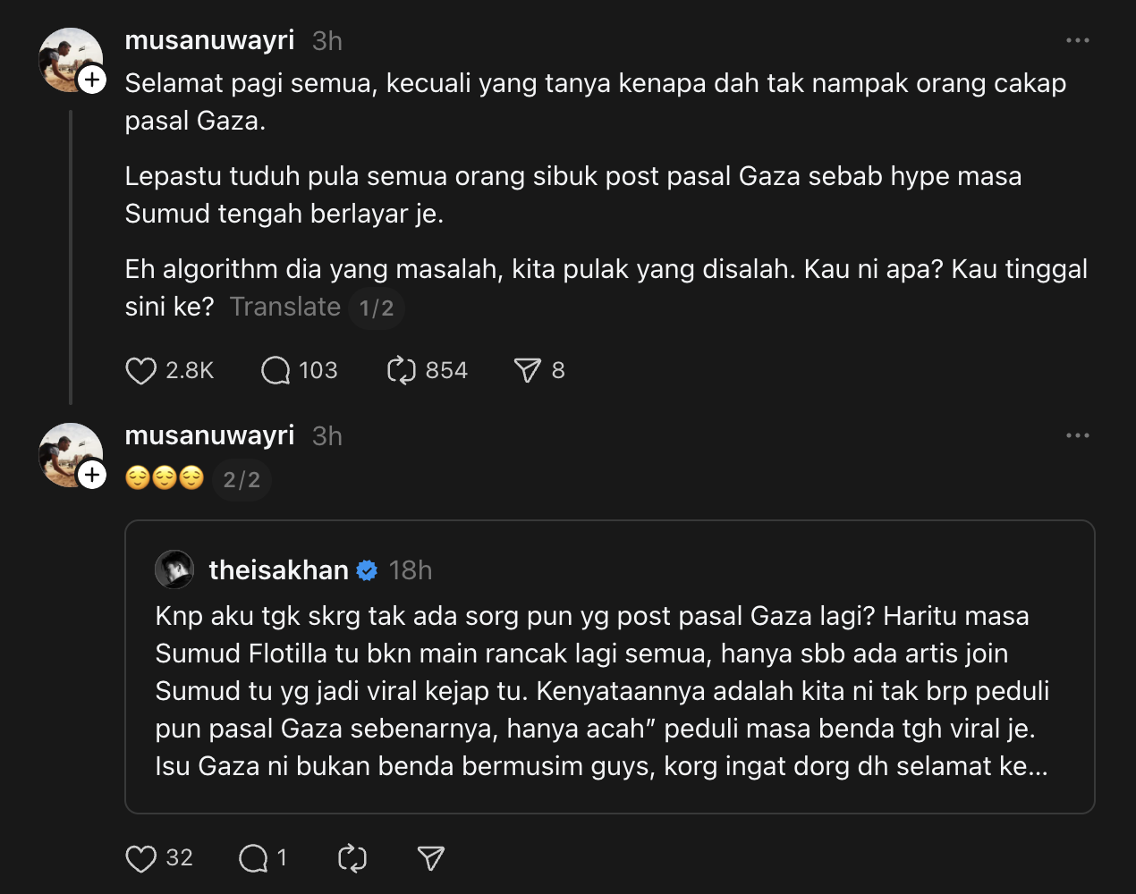 “Selamat pagi semua, kecuali yang tanya kenapa dah tak nampak orang cakap pasal Gaza. Lepastu tuduh pula semua orang sibuk post pasal Gaza sebab hype masa Sumud tengah berlayar je.