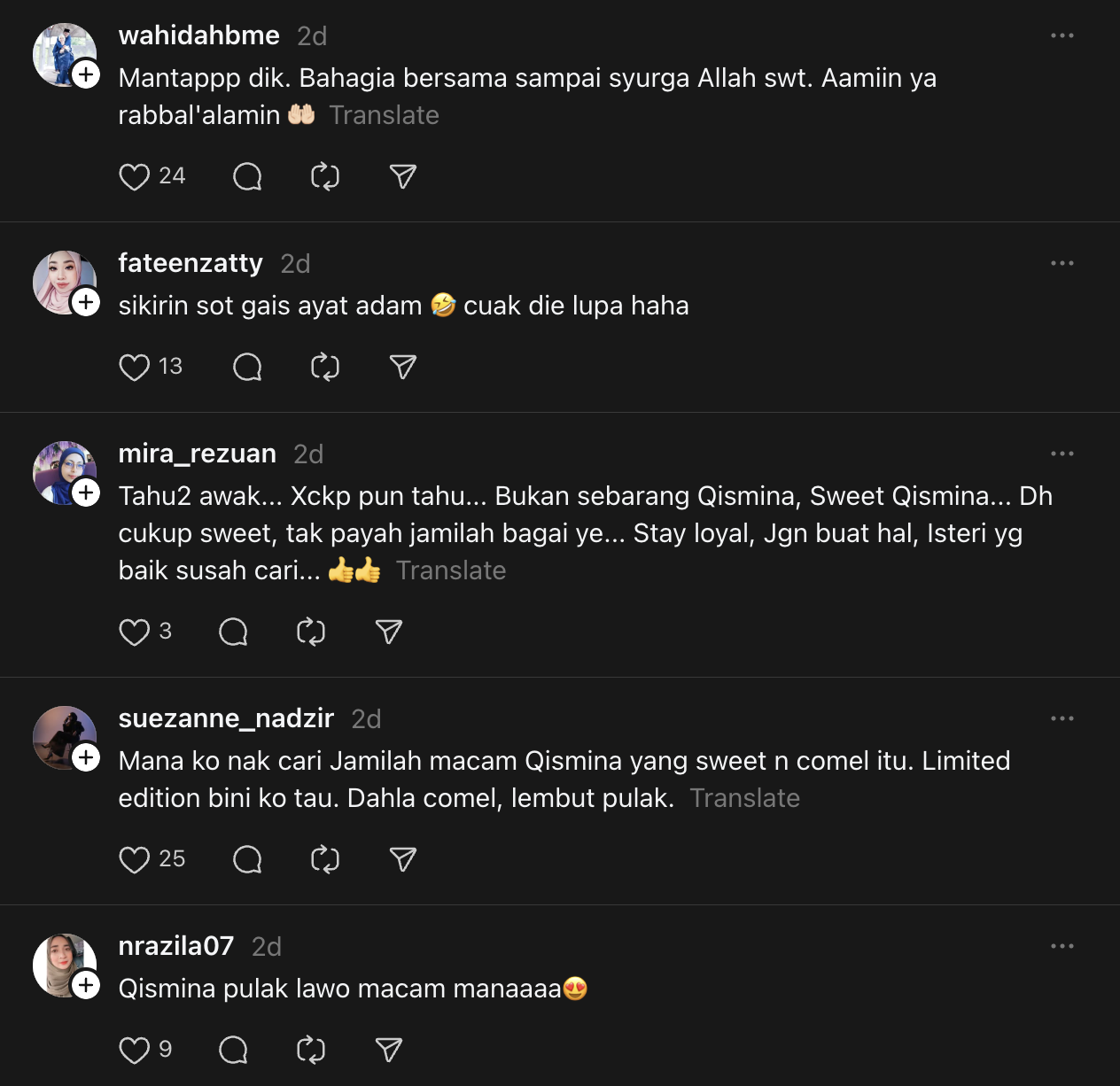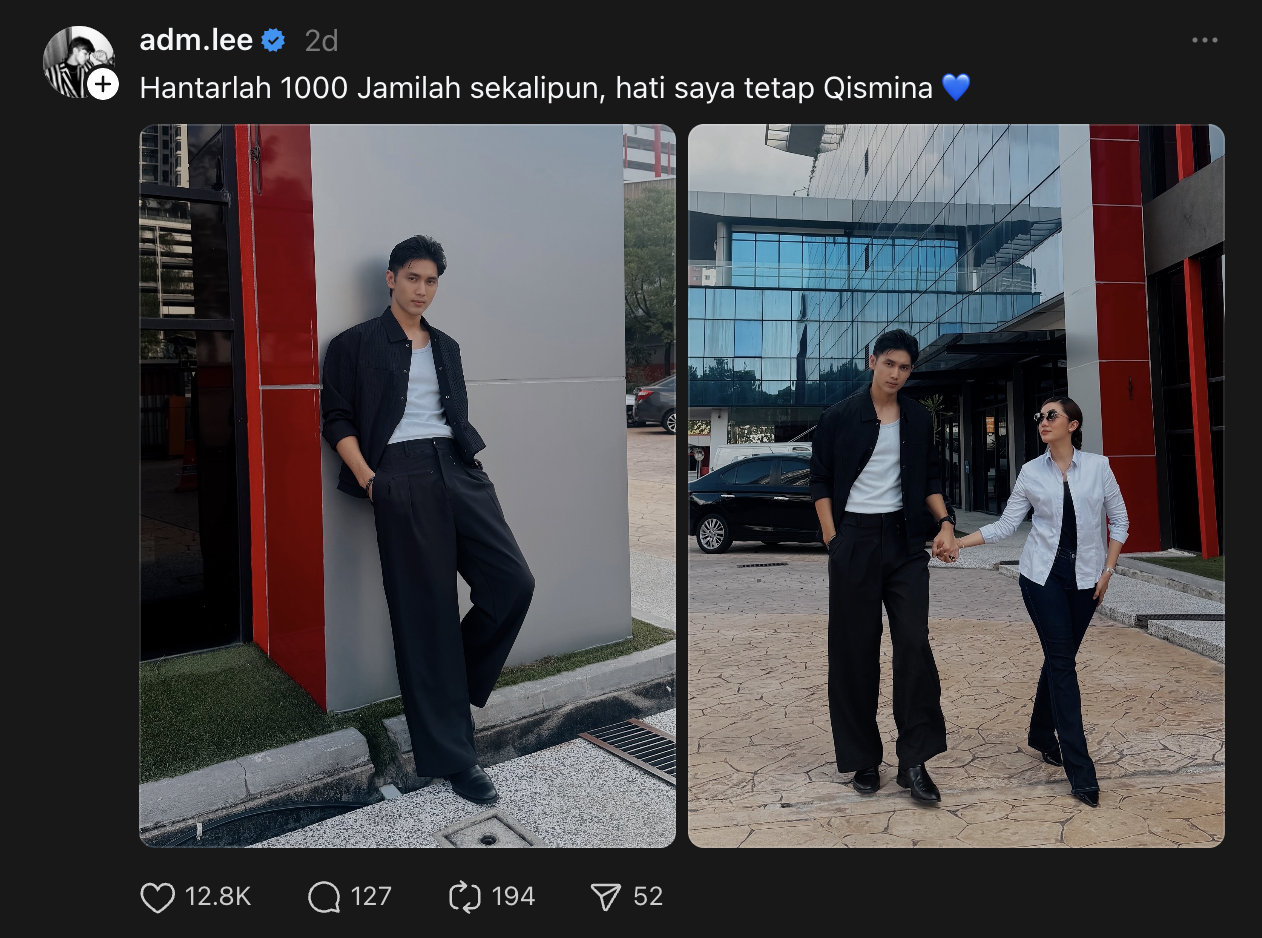 - Dalam kapsyen, Adam menegaskan kesetiaannya dengan berkata, "Hantarlah 1000 Jamilah sekalipun, hati saya tetap Qismina 💙."