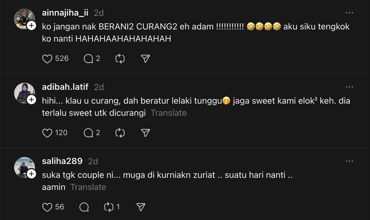 - Rata-rata netizen memberi amaran supaya Adam tidak curang terhadap isterinya dalam ruangan komen.