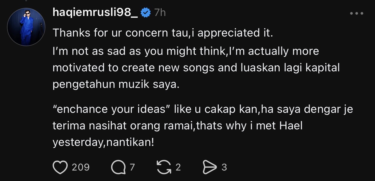 “Saya dulu peminat Haqiem sebab dia sangat kreatif. Jangan risau, jangan overthink. Mungkin boleh cuba kolaborasi dengan komposer lain untuk kembangkan idea. Awak ada potensi tinggi, jangan putus asa,” tulis individu berkenaan.