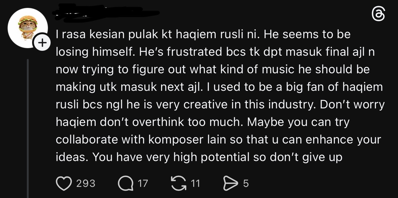 Menerusi hantaran di platform Threads, individu tersebut mengakui berasa simpati selain menyifatkan Haqiem sebagai antara bakat kreatif dalam industri muzik tempatan.