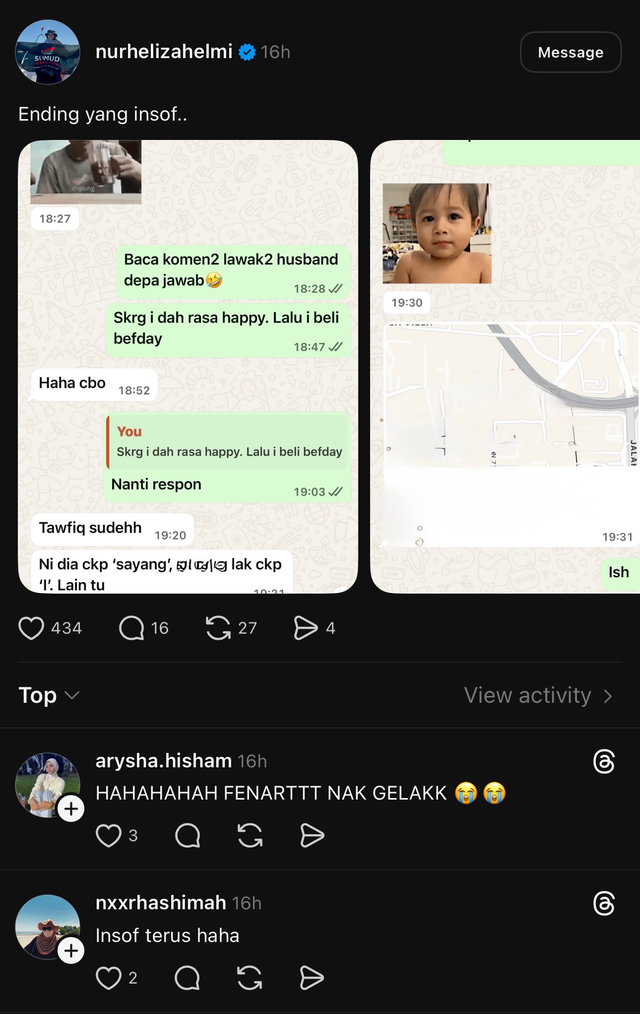 Namun lain pula jadinya apabila Heliza mengatakan dia sedikit ‘insaf’ selepas melihat balasan WhatsApp yang diberikan suaminya.
