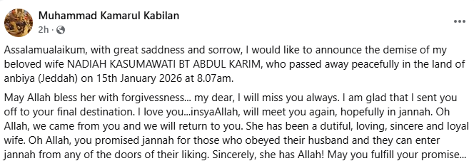 “Dengan penuh rasa dukacita dan kesedihan yang mendalam, saya ingin memaklumkan pemergian isteri tercinta saya, Nadiah Kasumawati Abdul Karim, yang telah kembali ke rahmatullah dengan tenang di bumi Anbiya (Jeddah) pada 15 Januari 2026, pada pukul 8.07 pagi.