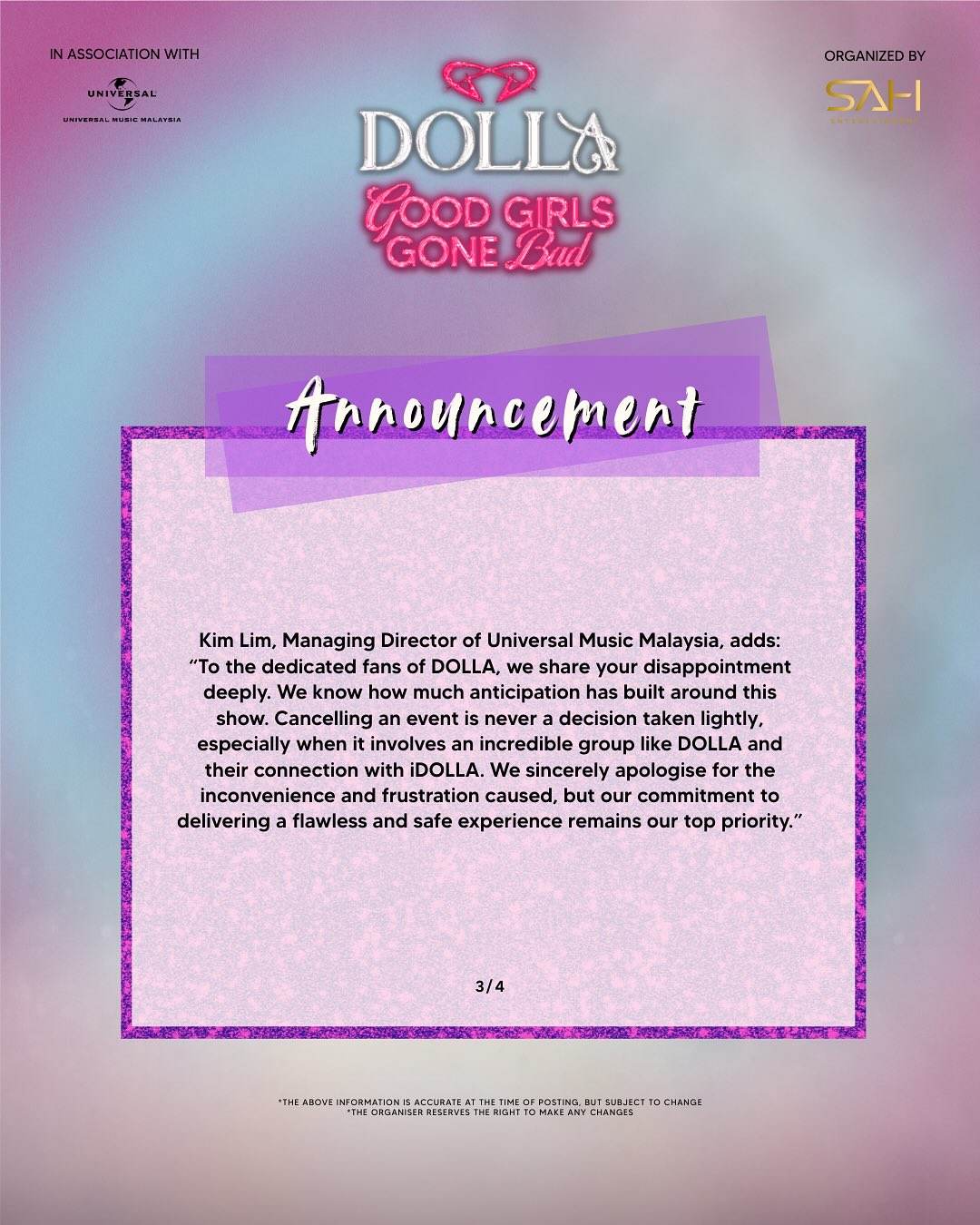 Dalam pada itu, Pengarah Urusan Universal Music Malaysia, Kim Lim, turut berkongsi kekecewaannya terhadap pembatalan tersebut, apatah lagi selepas melihat sokongan luar biasa peminat Dolla, iDolla.