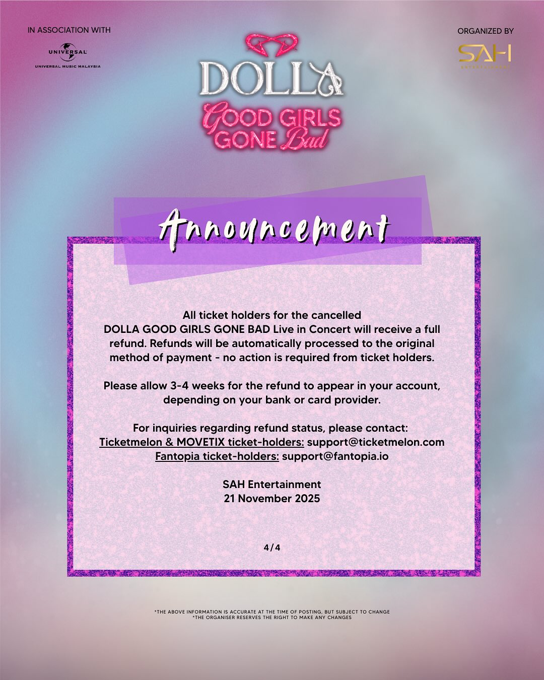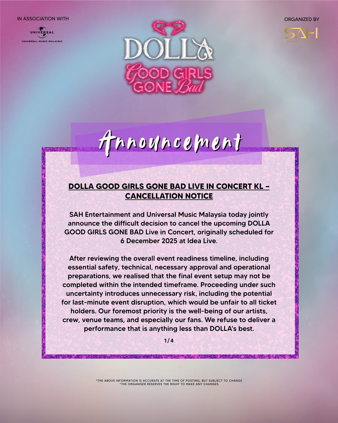 Peminat kumpulan Dolla dikejutkan dengan berita pembatalan konsert Dolla Good Girls Gone Bad Live in Concert yang dijadualkan berlangsung pada 6 Disember 2025 di Idea Live Arena.