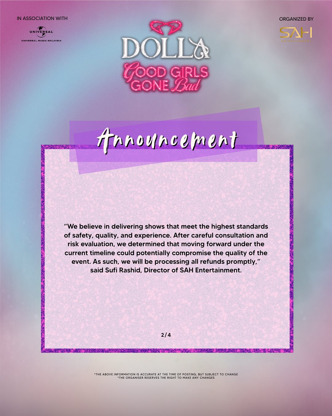 “Kami enggan menyampaikan persembahan yang kurang daripada apa yang terbaik daripada Dolla,” katanya dalam kenyatan tersebut.