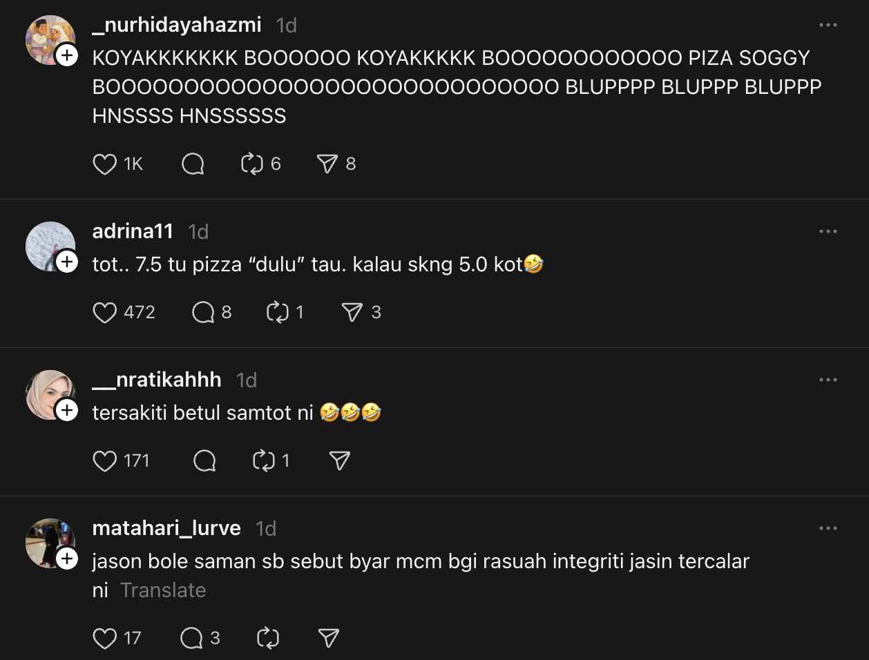 Menerusi hantaran di platform Threads, individu tersebut mendakwa Jason telah dibayar oleh Cik Epal selepas membuat ulasan mengenai pizza keluarannya.