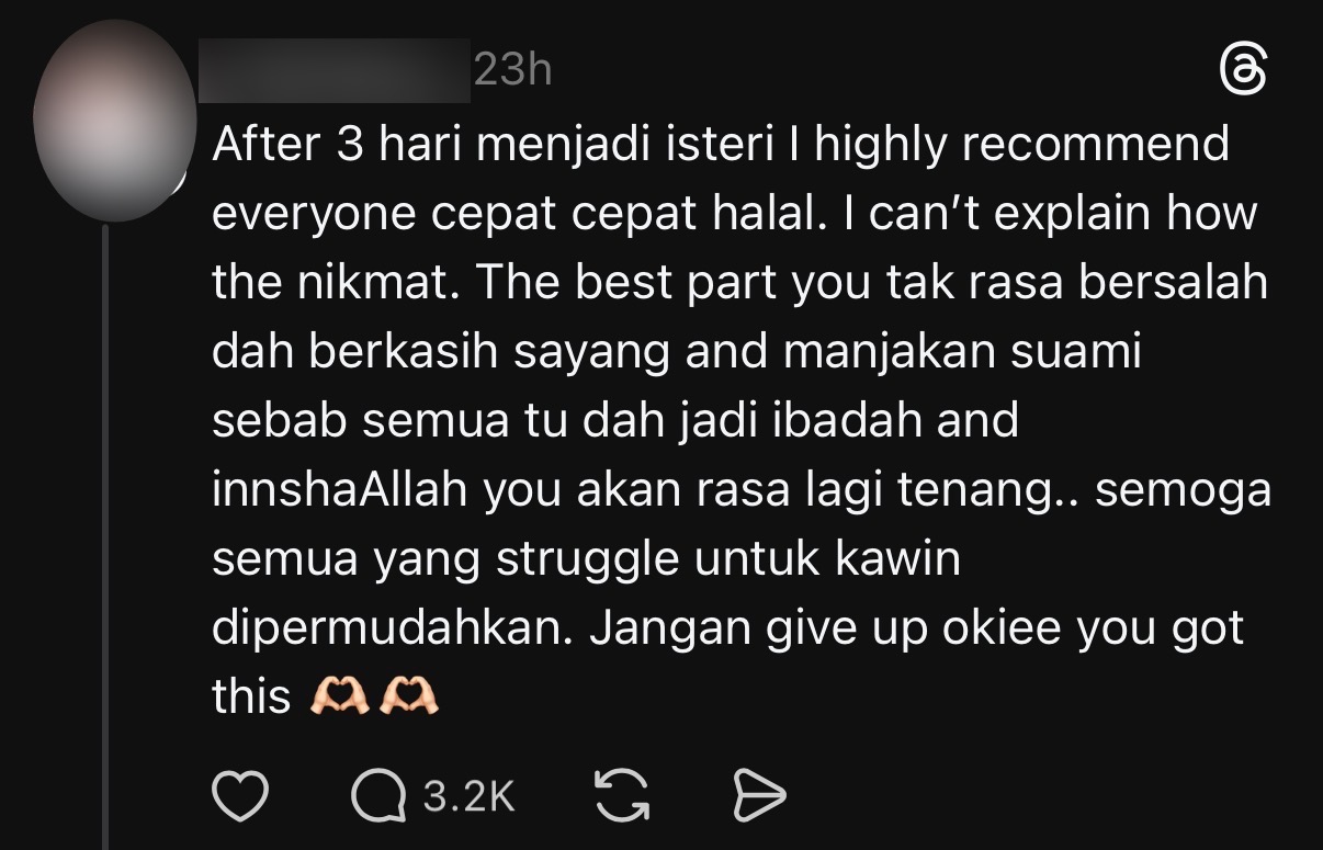 “Selepas tiga hari menjadi isteri, saya sangat sarankan semua orang untuk cepat halal. I can’t explain how the nikmat.