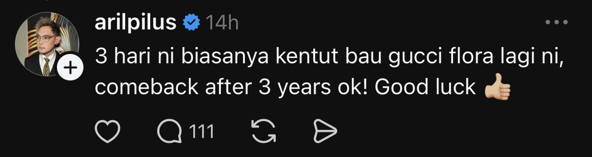 “Tiga hari ni biasanya kentut bau Gucci Flora lagi ni, comeback selepas tiga tahun! Good luck,” komen Aril.
