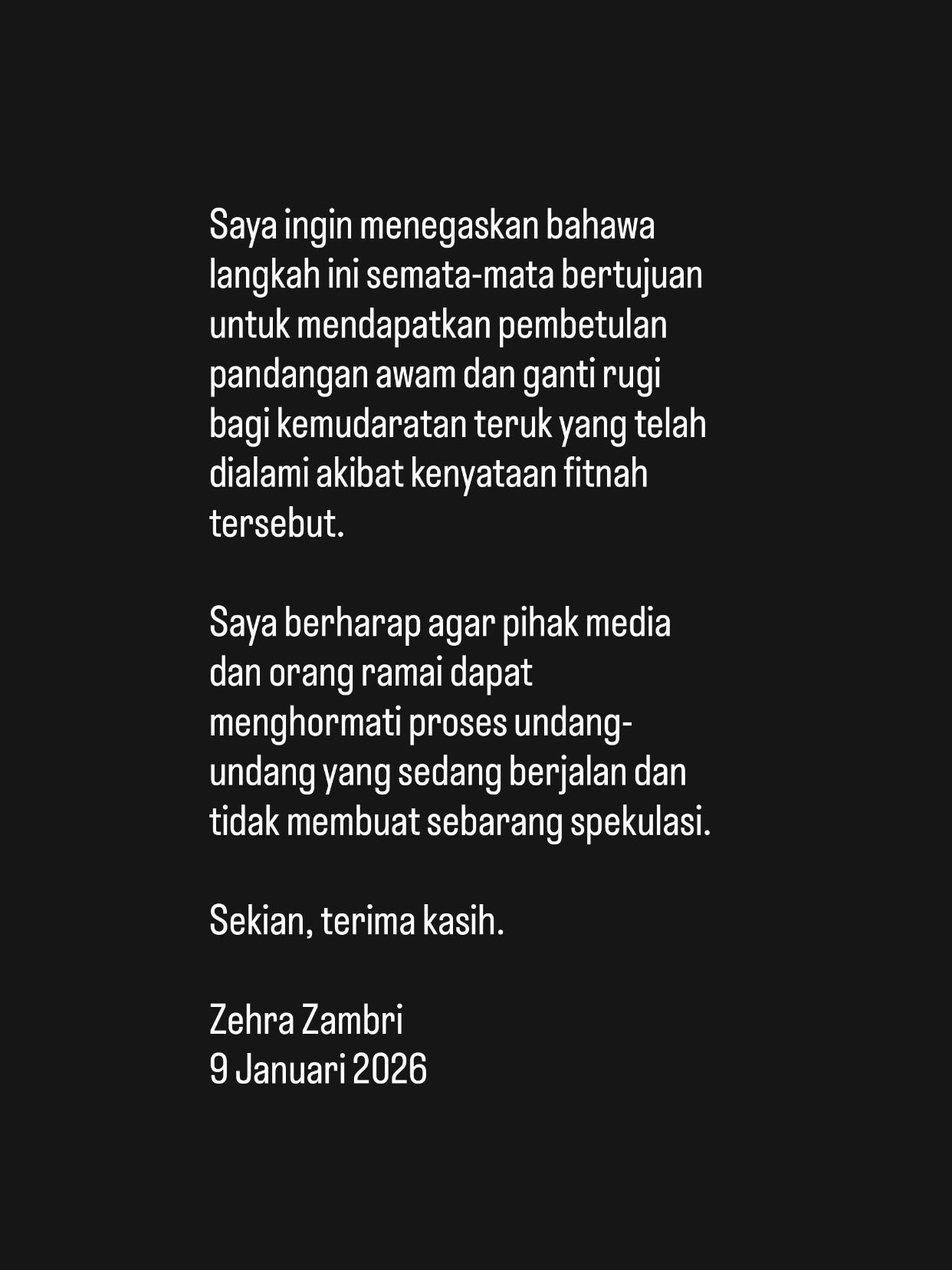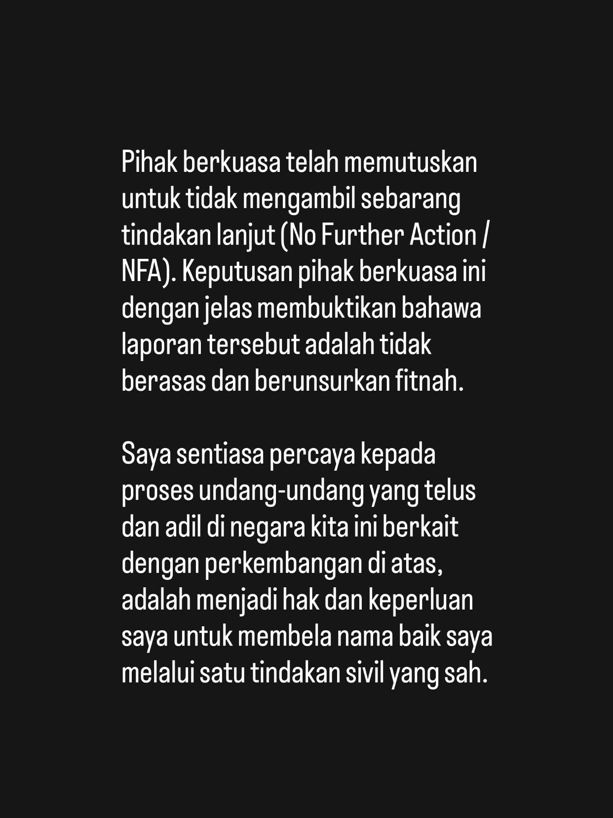 “Saya sentiasa percaya kepada proses undang-undang yang telus dan adil di negara kita. Berdasarkan perkembangan ini, adalah menjadi hak dan keperluan saya untuk mempertahankan nama baik melalui tindakan sivil yang sah.