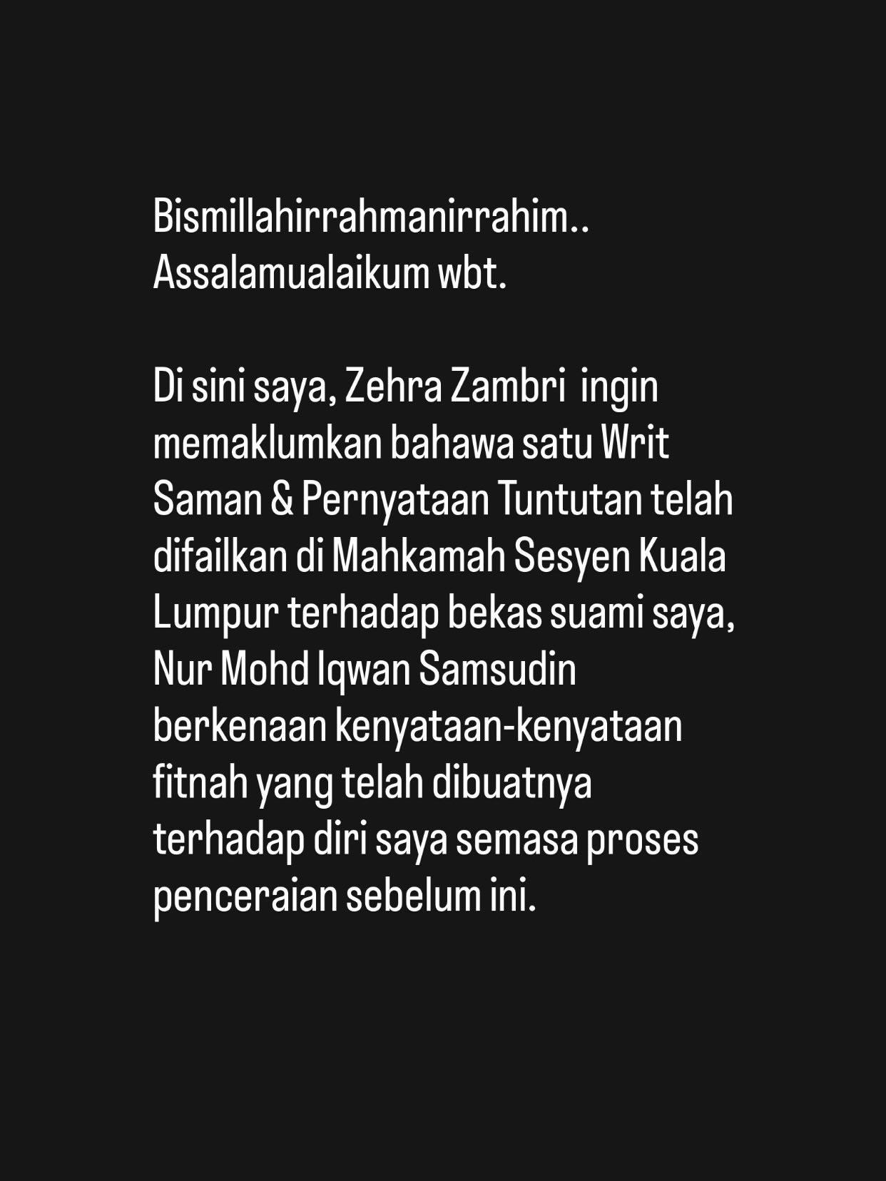 Sekadar info, Zehra Zambri telah sah bercerai talak satu dengan suaminya, Nur Mohd Iqwan Samsudin melalui talak raj’ie di Mahkamah Rendah Syariah Hulu Langat, Bangi pada 20 Ogos 2025.