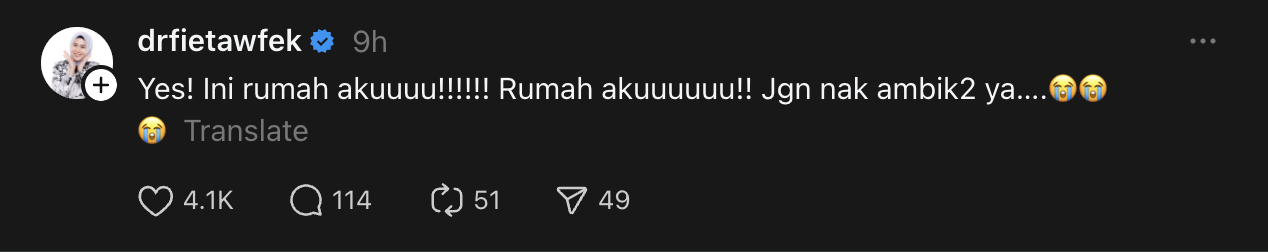 Menerusi perkongsian tersebut, Dr. Afifah atau lebih mesra disapa sebagai Dr. Fie menyatakan mengenai hak terhadap sebuah kediaman.
