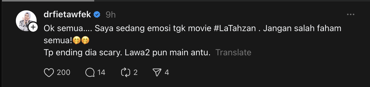 “Ok semua…. Saya sedang emosi tgk movie #LaTahzan . Jangan salah faham semua!🤭🤭