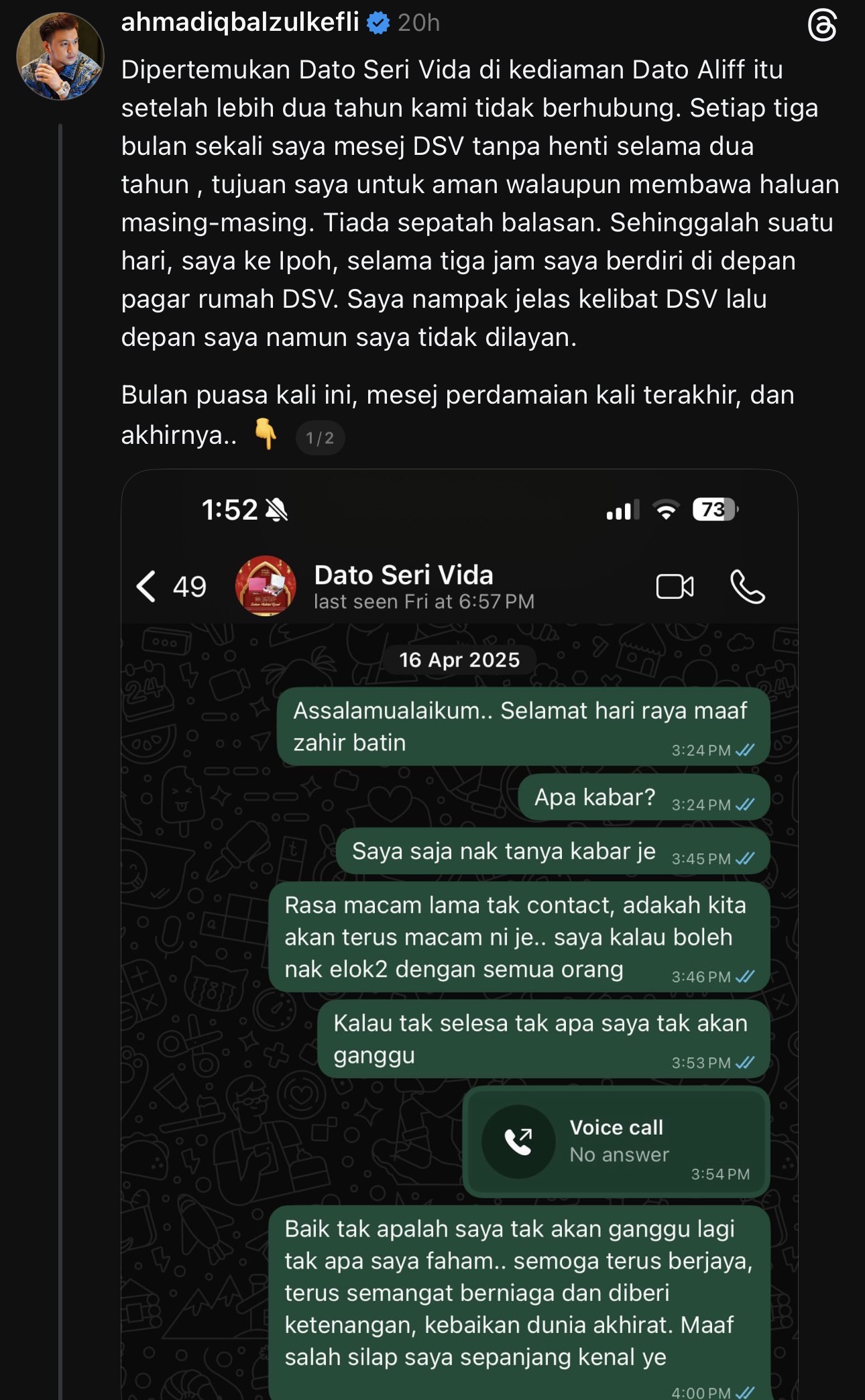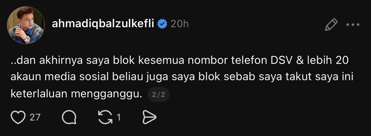 “Bulan puasa kali ini, mesej perdamaian kali terakhir dan akhirnya saya blok kesemua nombor telefon DSV dan lebih 20 akaun media sosial beliau juga saya blok sebab saya takut saya ini keterlaluan mengganggu,” kongsinya.