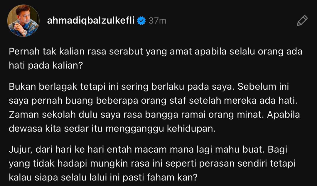 - Ahmad Iqbal Zulkefli, pempengaruh media sosial dan usahawan, pernah rasa bangga apabila ada wanita yang menaruh hati padanya.