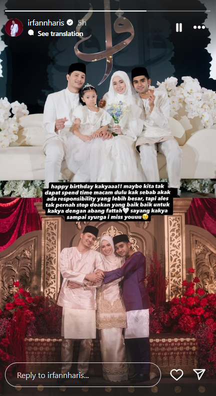 “Happy birthday Kakya!! Maybe kita tak dapat spend time macam dulu kak sebab akak ada responsibility yang lebih besar, tapi Ales tak pernah stop doakan yang baik-baik untuk Kakya dengan Abang Fattah. Sayang Kakya sampai syurga. I miss youuu,” tulisnya bersama emoji sedih.