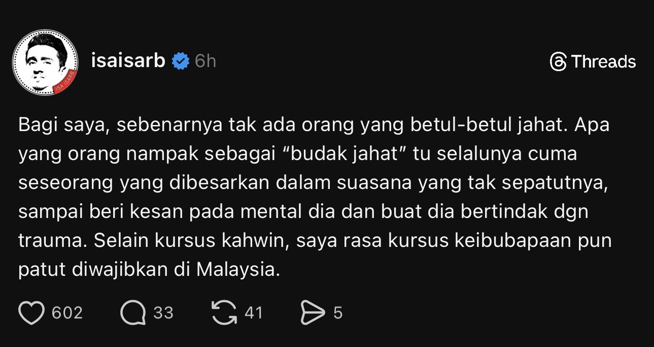 Menerusi hantaran di platform Threads, Isa berkata faktor persekitaran dan didikan sejak kecil antara menjadi punca utama yang membentuk tingkah laku seseorang.