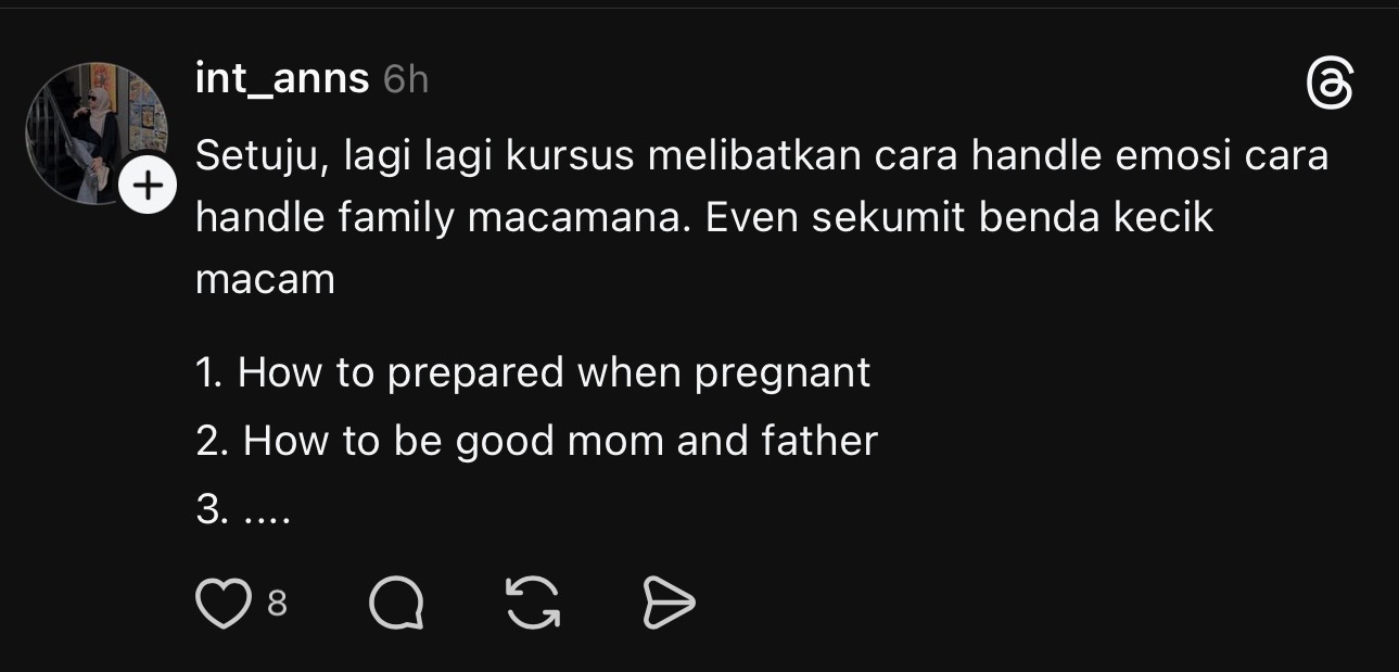 “Selain kursus kahwin, saya rasa kursus keibubapaan pun patut diwajibkan di Malaysia,” luahnya.