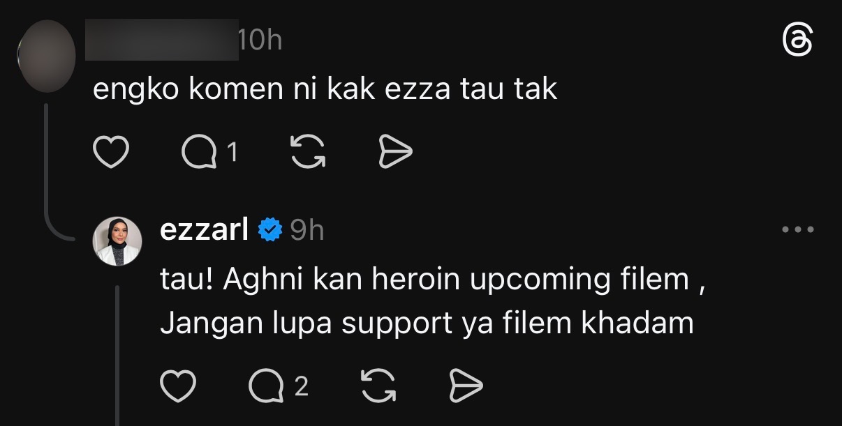 “Tahu! Aghniny kan heroin untuk filem terbaharu nanti. Jangan lupa support filem Khadam,” tulis Ezza.