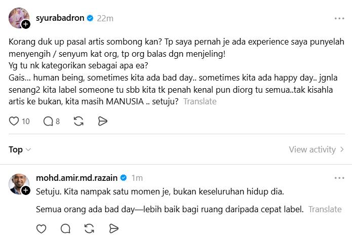Menerusi satu hantaran di Threads, Syura meluahkan bahawa situasi tersebut tidak wajar dinilai secara terburu-buru kerana setiap individu mempunyai keadaan dan emosi yang berbeza pada waktu tertentu.