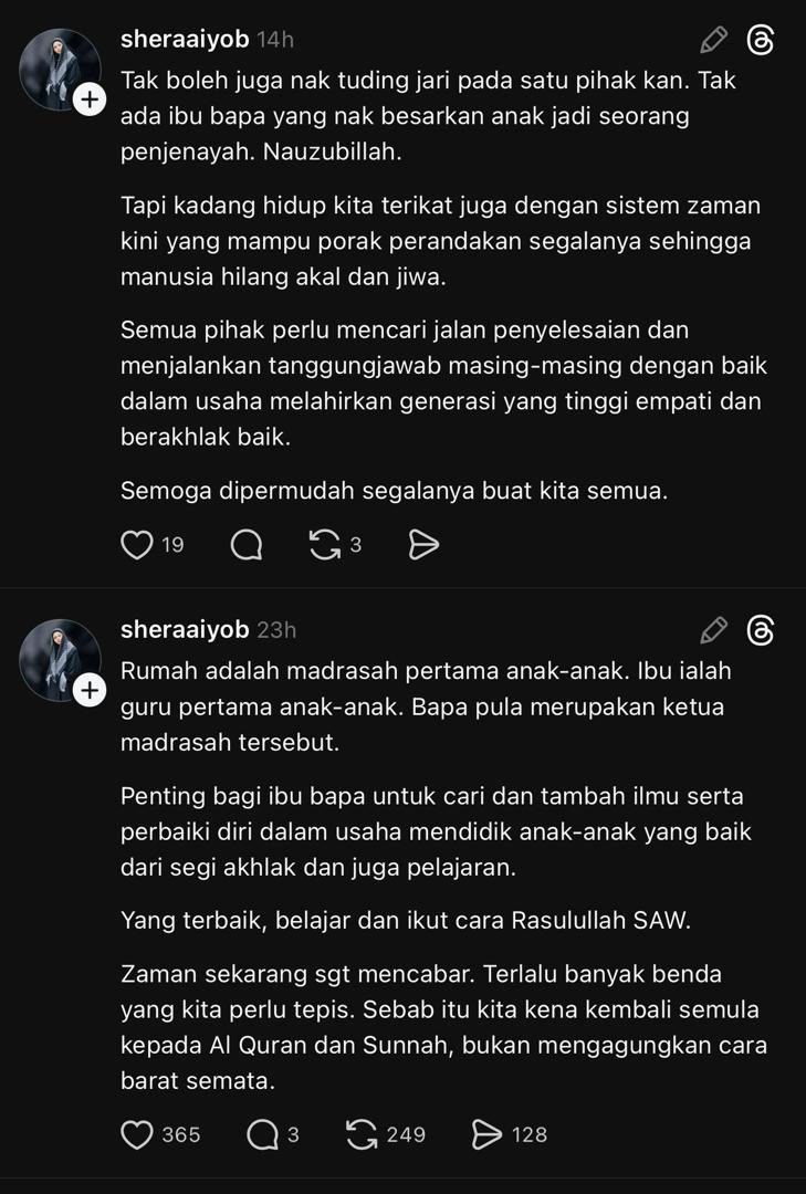 Menerusi hantaran di Threads, Shera mengingatkan bahawa pendidikan sebenar bermula dari rumah, dan ibu bapa perlu sedar bahawa mereka adalah pendidik utama kepada anak-anak sejak kecil.