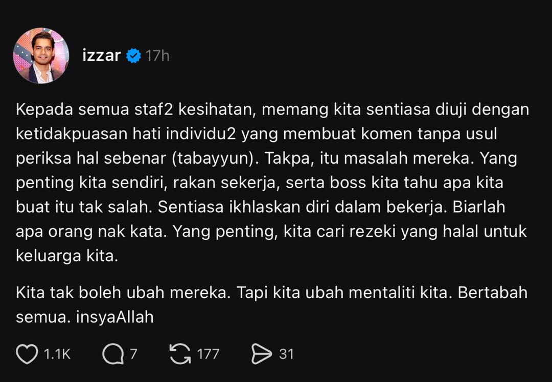 Menerusi perkongsian di Threads, Dr Izzar menzahirkan rasa kesal terhadap pihak yang membuat hantaran negatif mengenai perkara itu.
