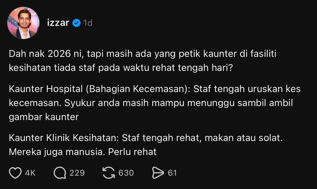 “Dah nak 2026 ni, tapi masih ada yang petik kaunter di fasiliti kesihatan tiada staf pada waktu rehat tengah hari?