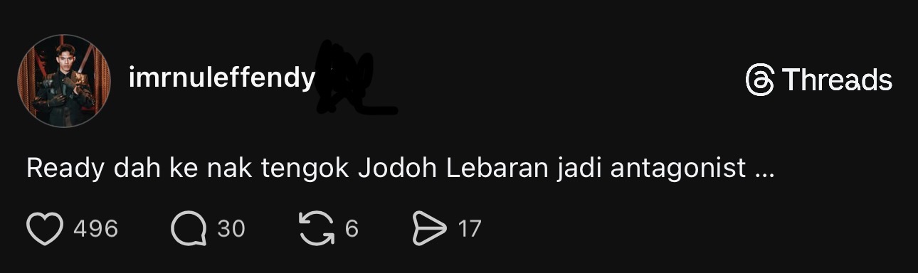 “Ready dah ke nak tengok Jodoh Lebaran jadi antagonis,” tulisnya.
