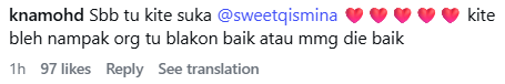 "Sweet Qismina is a girl's girl. Sincere, humble and supportive," tambah pengguna lain pula.