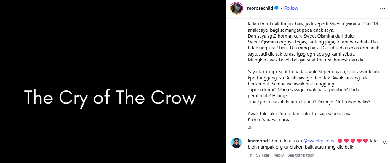 "Kalau betul nak tunjuk baik, jadi seperti Sweet Qismina. Dia DM anak saya, bagi semangat pada anak saya. Dan saya sangat-sangat hormat cara Sweet Qismina dari dulu.