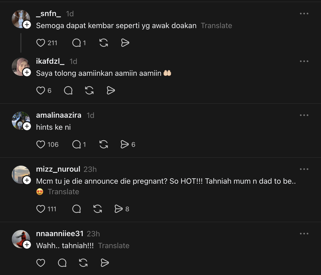 Malah ada juga mendoakan agar impian Mimi atau nama lengkapnya Mimi Rozaiana Zainal Abidin untuk memiliki anak kembar tercapai.