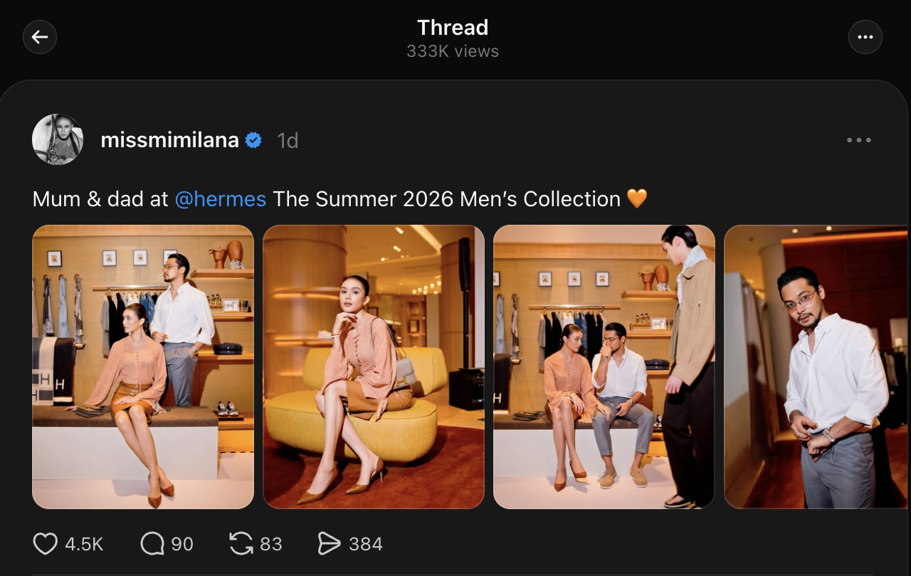 “Mum & dad at  @hermes The Summer 2026 Men’s Collection 🧡,” tulisnya ringkas.