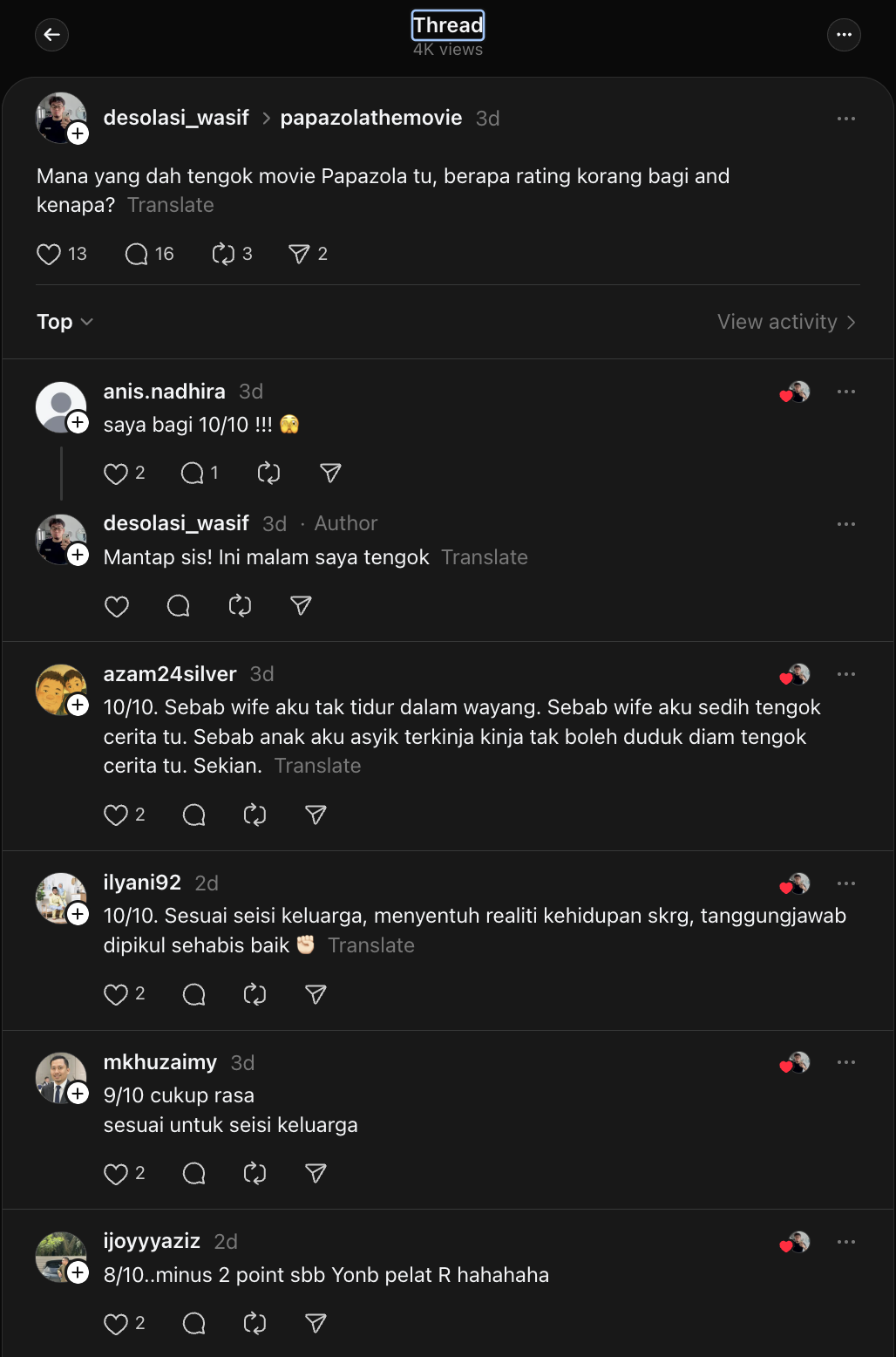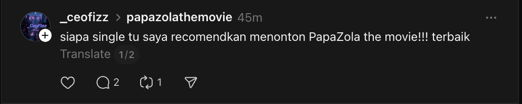 Menerusi tinjauan di platform Threads, rata-rata memberikan rating 10/10 dan mengajak rakyat Malaysia untuk menonton filem terbaharu arahan Nizam Abd Razak bersama Raja Nukman Raja Mohd Nordin dan Dzubir Mohammed Zakaria.