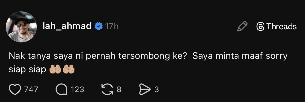 Menerusi perkongsian di platform Threads, Lah secara terbuka bertanyakan kepada orang ramai sama ada dirinya pernah dilihat sebagai seorang yang sombong.