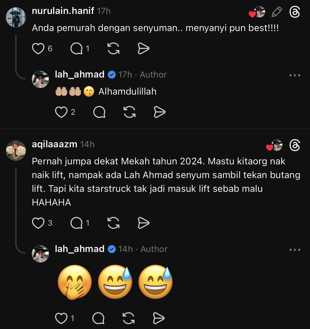 - Lah terharu dengan respon tersebut dan membalas dengan ucapan terima kasih sebagai tanda penghargaan kepada peminat.