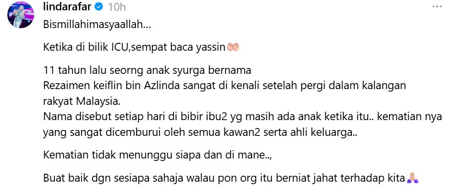 “11 tahun lalu seorang anak syurga bernama Rezaimen Keiflin bin Azlinda sangat di kenali setelah pergi dalam kalangan rakyat Malaysia,” tulisnya.