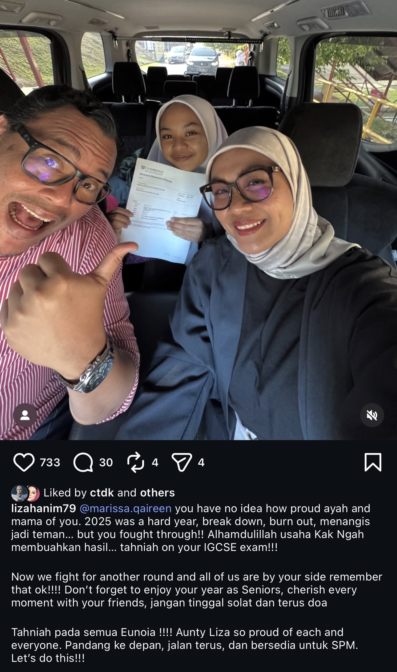 Menerusi perkongsian di Instagram, sebagai ibu, Liza mengakui perjalanan tahun 2025 bukanlah mudah buat anaknya apabila terpaksa berdepan dengan tekanan, keletihan emosi selain pelbagai cabaran sepanjang tempoh pembelajaran.