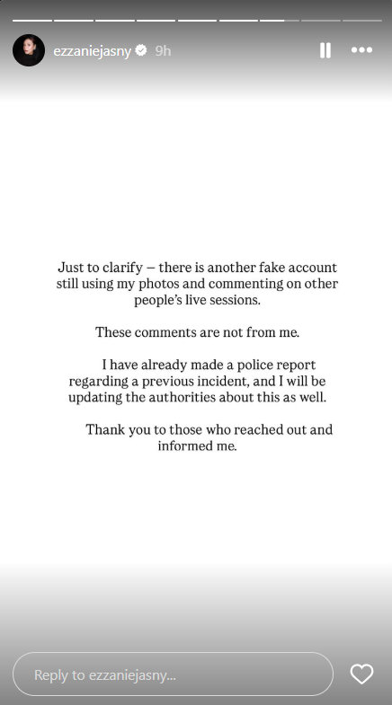 Menerusi beberapa hantaran di Instagram Stories, Ezzanie mendedahkan kewujudan akaun palsu yang aktif meninggalkan komen tidak wajar di sesi siaran langsung individu lain, sekali gus mencetuskan salah faham seolah-olah komen tersebut datang daripadanya.