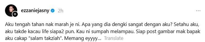 “Aku tengah tahan nak marah je ni. Apa yang dia dengki sangat dengan aku? Setahu aku, aku takde kacau life siapa-siapa pun. Kau ni sumpah melampau. Siap post gambar mak bapak aku cakap ‘salam takziah’. Memang ey.