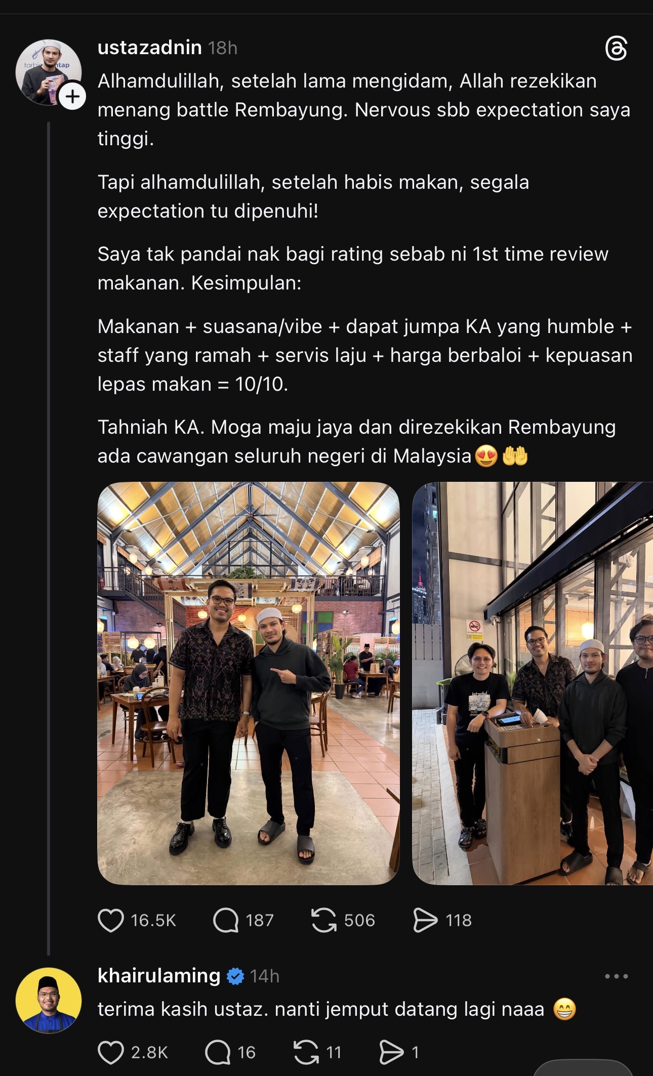 Dalam hantaran yang sama, Ustaz Adnin juga turut memberikan ulasannya dan memuji keseluruhan aspek yang ditawarkan oleh Rembayung, termasuk kualiti makanan, suasana restoran, layanan kakitangan serta nilai harga yang diberikan.