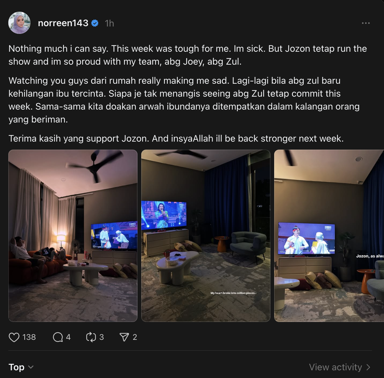 - Dia berkongsi rasa sedih menonton persembahan Jozon dari rumah melalui hantaran di Threads.
