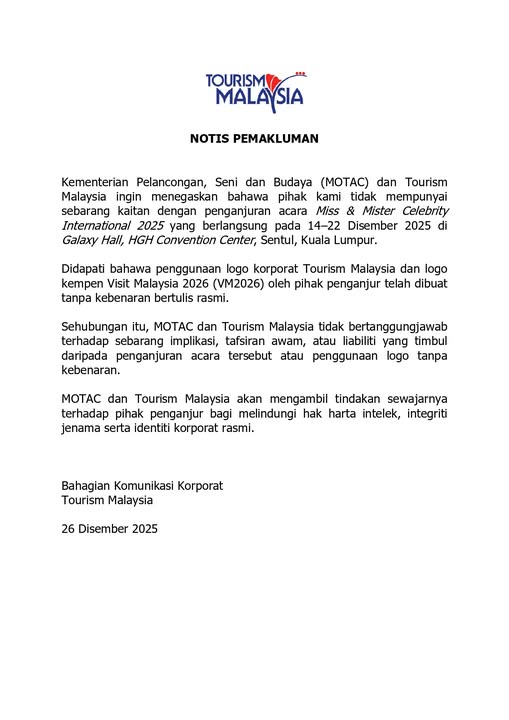 - Penggunaan logo rasmi Tourism Malaysia dan Visit Malaysia 2026 oleh penganjur acara tersebut dilakukan tanpa kebenaran bertulis, dan tindakan akan diambil untuk melindungi hak harta intelek.