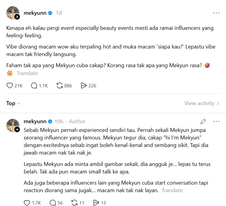 “Mekyun! I don’t know why some influencers ada vibe begitu, tapi saya perasan kalau jumpa rakan artis (actors/singers) diorang lebih rajin bersosial dan lebih chill di events.”