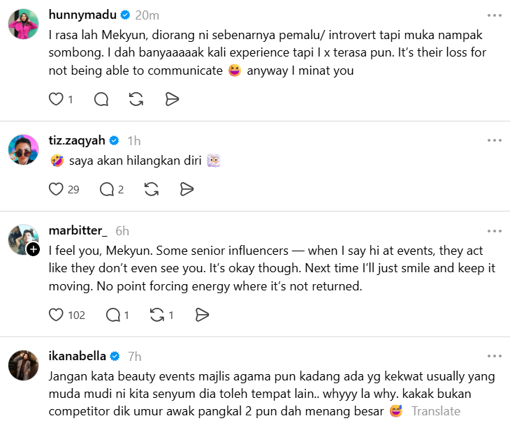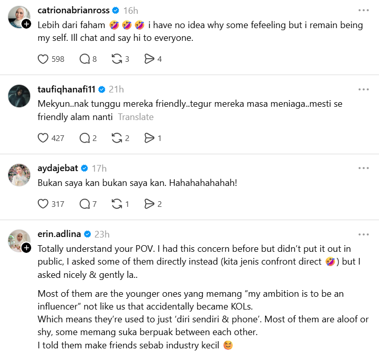 "Ada juga beberapa influencers lain yang Mekyun cuba start conversation tapi reaction diorang sama juga… macam nak tak nak layan," luahnya.