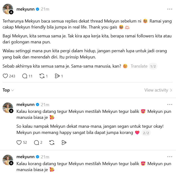 “Terharunya Mekyun baca semua replies dekat thread Mekyun sebelum ni. Ramai yang cakap Mekyun friendly bila jumpa in real life. Thank you gais.