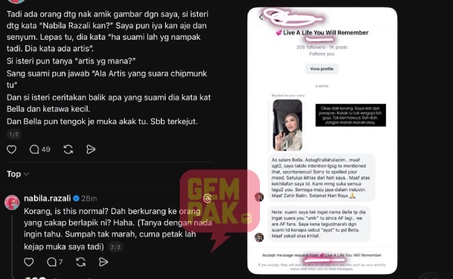 - Nabila Razali berkongsi pengalaman janggal apabila seorang individu memberi komen mengenai suaranya selepas minta bergambar dengannya.