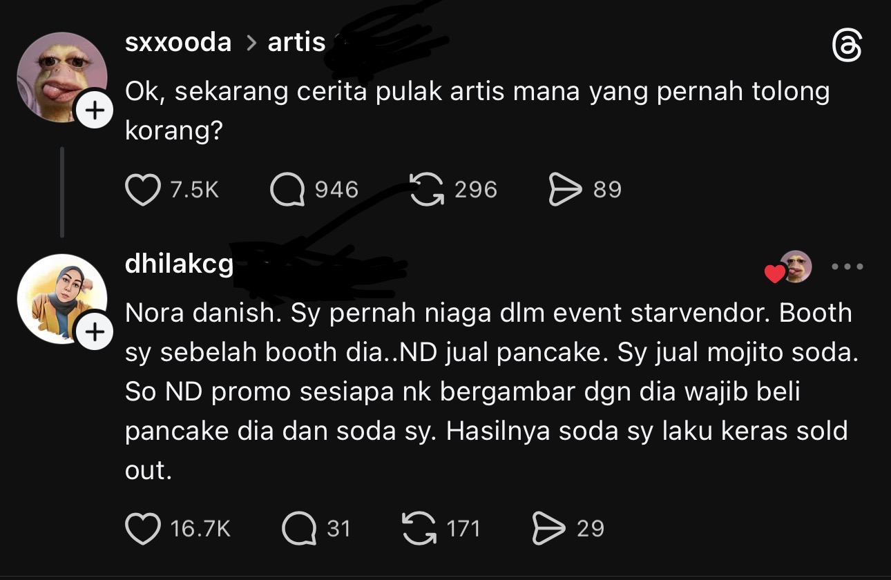 Susulan tular di platform Threads satu trend di mana netizen berkongsi pengalaman mereka yang berhadapan dengan selebriti yang tidak sombong peramah dan suka membantu, nama pelakon Nora Danish merupakan antara menjadi sebutan.