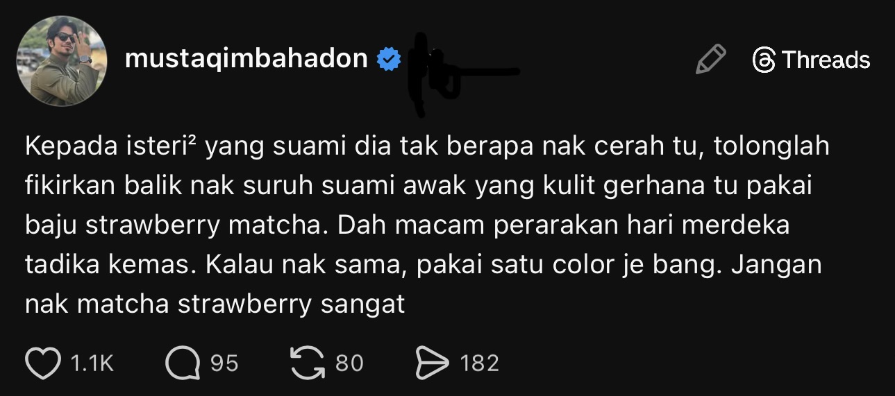 Menerusi hantaran di platform Threads, Mustaqim secara berseloroh menasihatkan golongan isteri supaya mempertimbangkan semula pilihan warna pakaian sekiranya ingin menggayakan konsep ‘Matcha Strawberry’ bersama pasangan.
