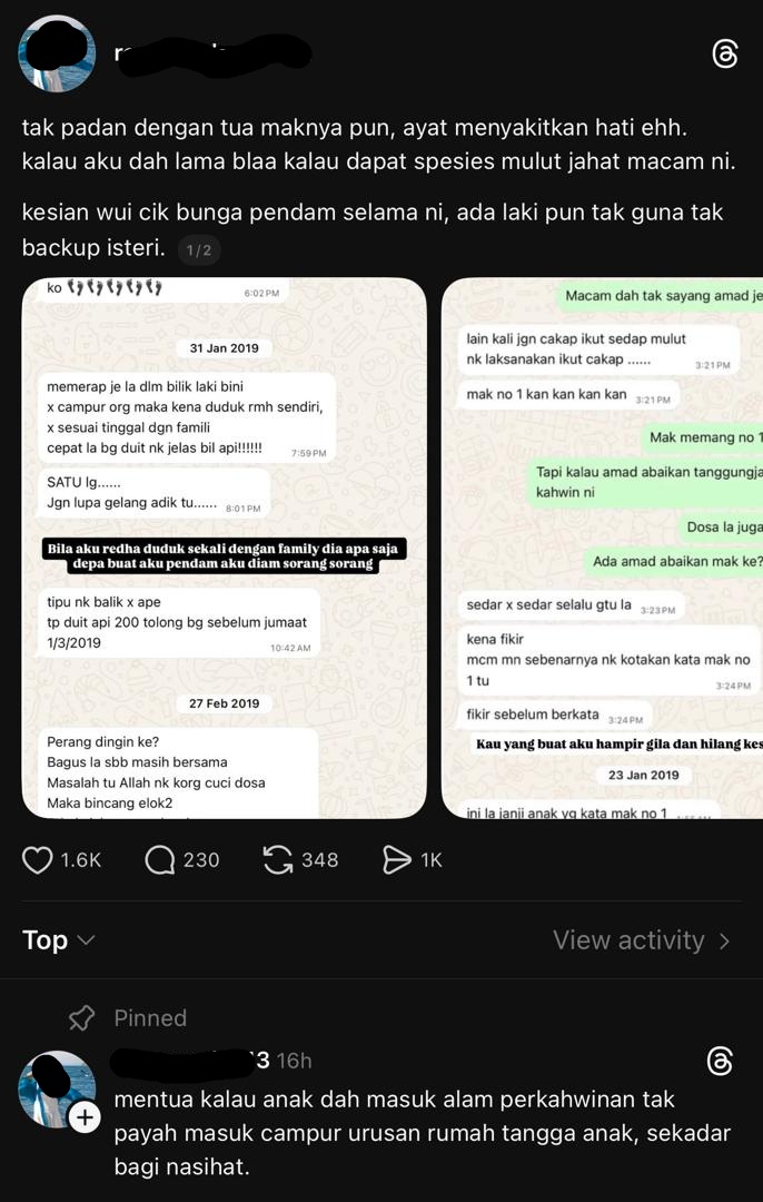 Menerusi hantaran yang dikongsikan semula oleh netizen di platform Threads, Cik Bunga atau nama sebenarnya Nur Mahfuzah Zulkifli dapat dilihat ibu mentuanya sibuk masuk campur dalam urusan keluarga mereka berdua.