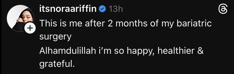 Menerusi perkongsian di Threads, Nora meluahkan rasa syukur kerana selesai menjalani prosedur tersebut dengan jayanya. Ujar Nora, dia juga kini berada dalam keadaan yang lebih sihat.